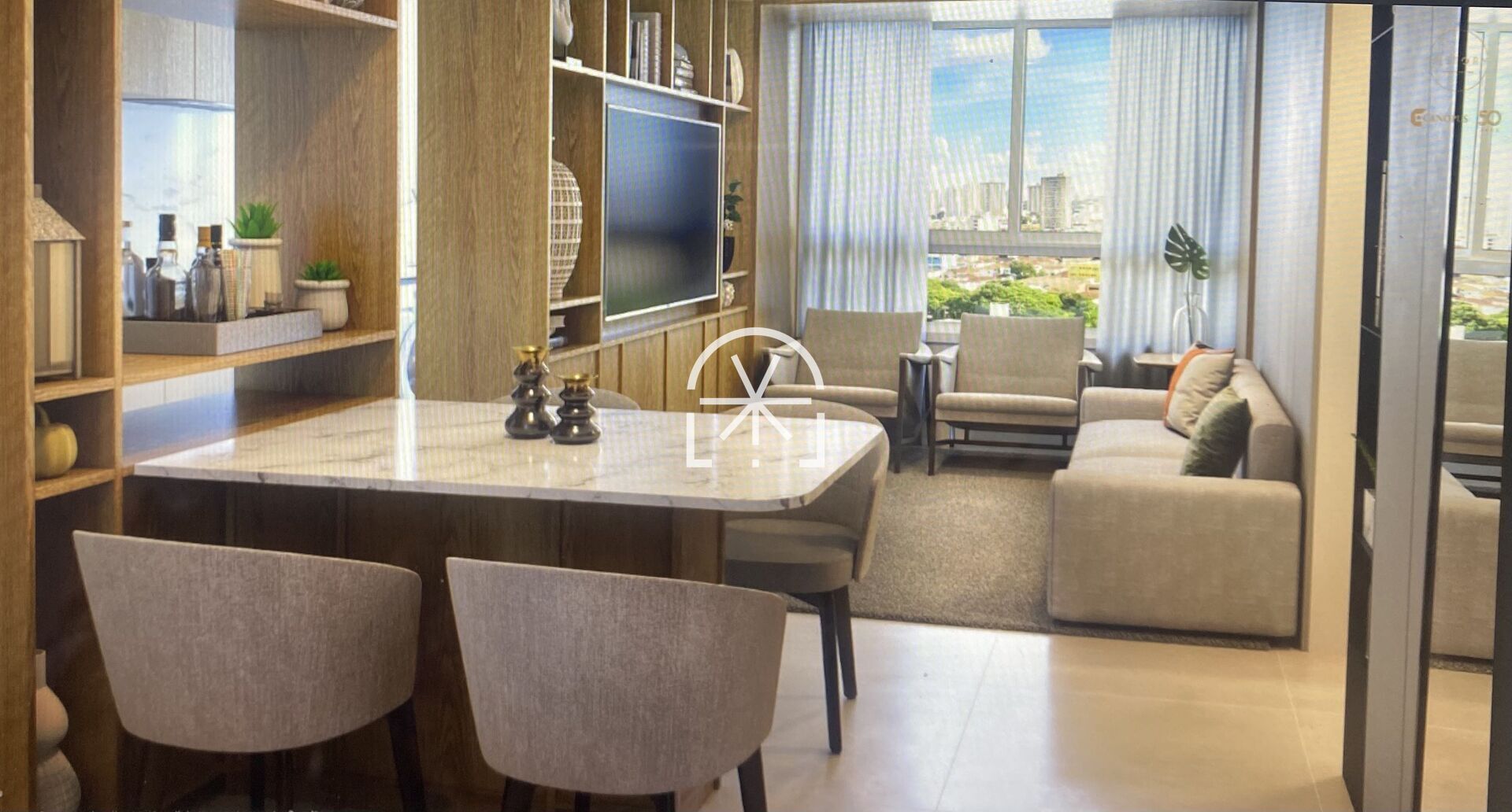 Porcelanato 90x90 na sala e na varanda e 60x60 na cozinha, área de serviço e nos banheiros Porcelanato 90x90 na sala, cozinha e área e 60x60 nos banhos