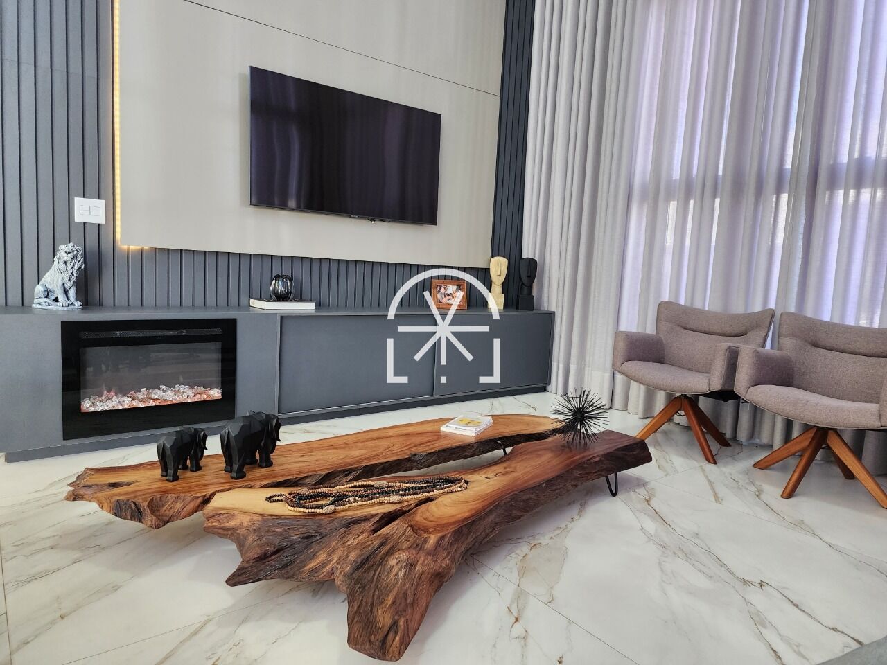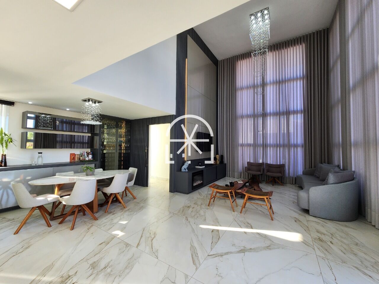 Sala ampla para 2 ambientes, pé direito duplo, integrado com cozinha americana, ilha central, espaço gourmet e lavabo.